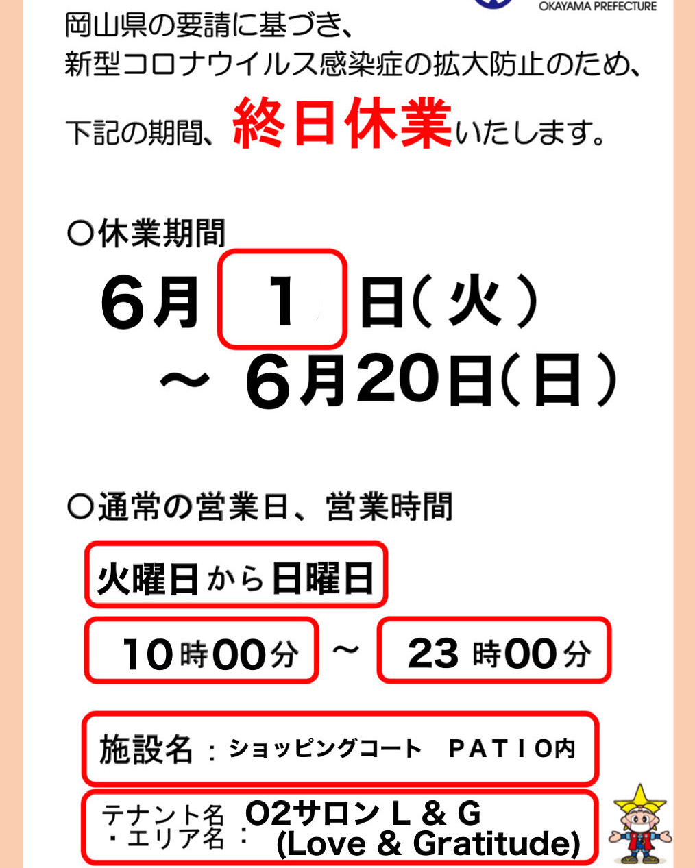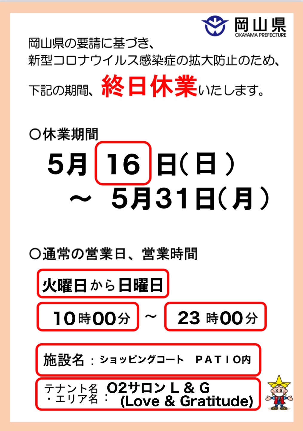 L&Gは、期間中休業させていただきます 21日は月曜日で定休日の為22日から再開予定です、よろしくお願いします